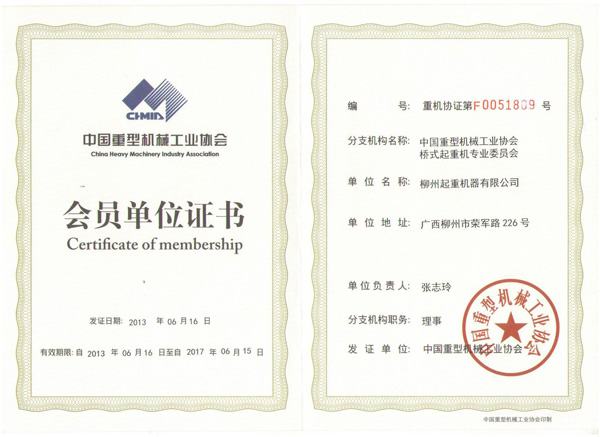 中國重型機(jī)械工業(yè)協(xié)會(huì)理事單位會(huì)員證書
